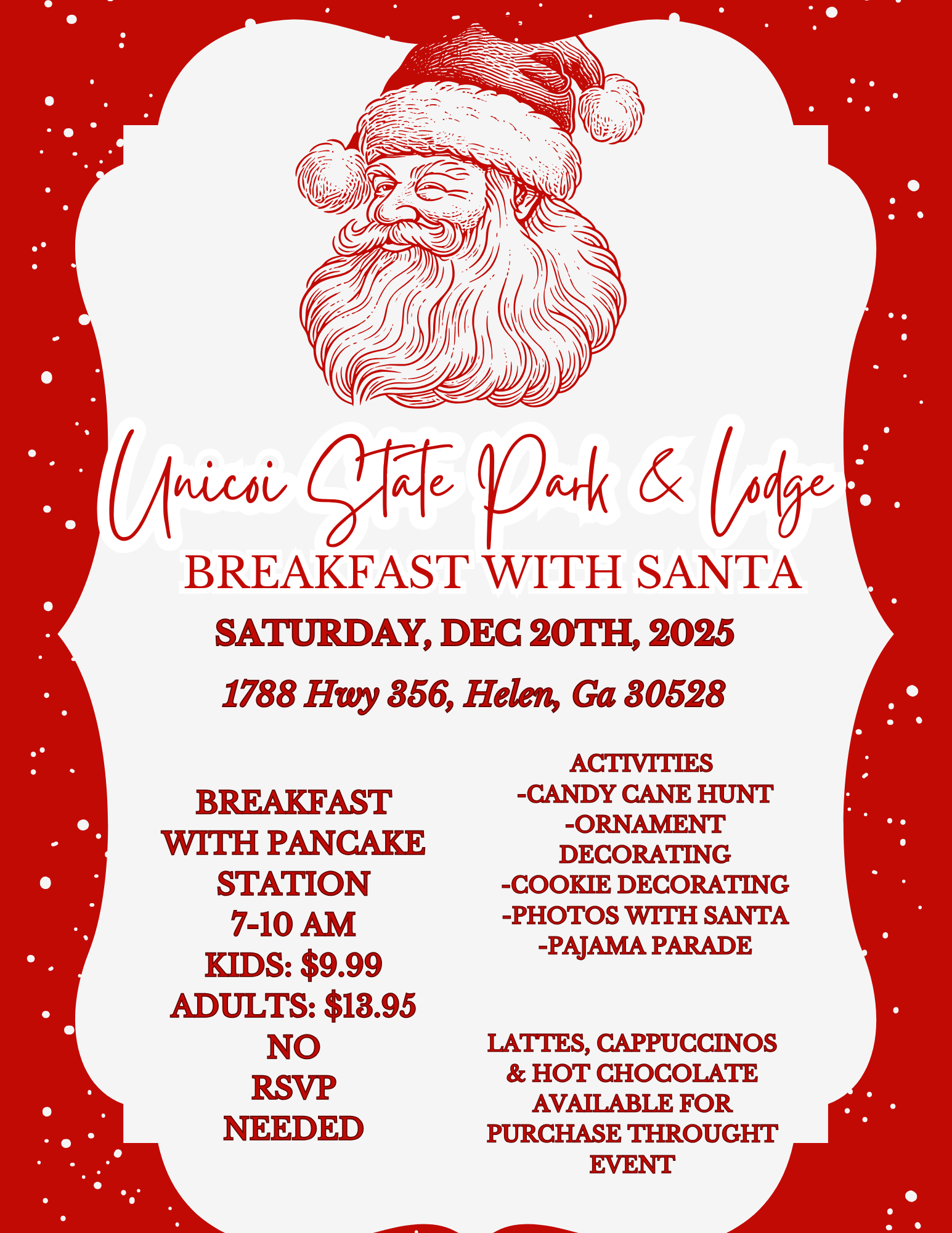 Join us in Unicoi State Park Lodge on Saturday, December 20, 2025 from 7am – 10am for a very special Breakfast with Santa! Pancake Station included in cost of the event. Activities include Candy Cane Hunt, Ornament, Decorating, Cooking Decorating, Photos with Santa and Pajama Parade.