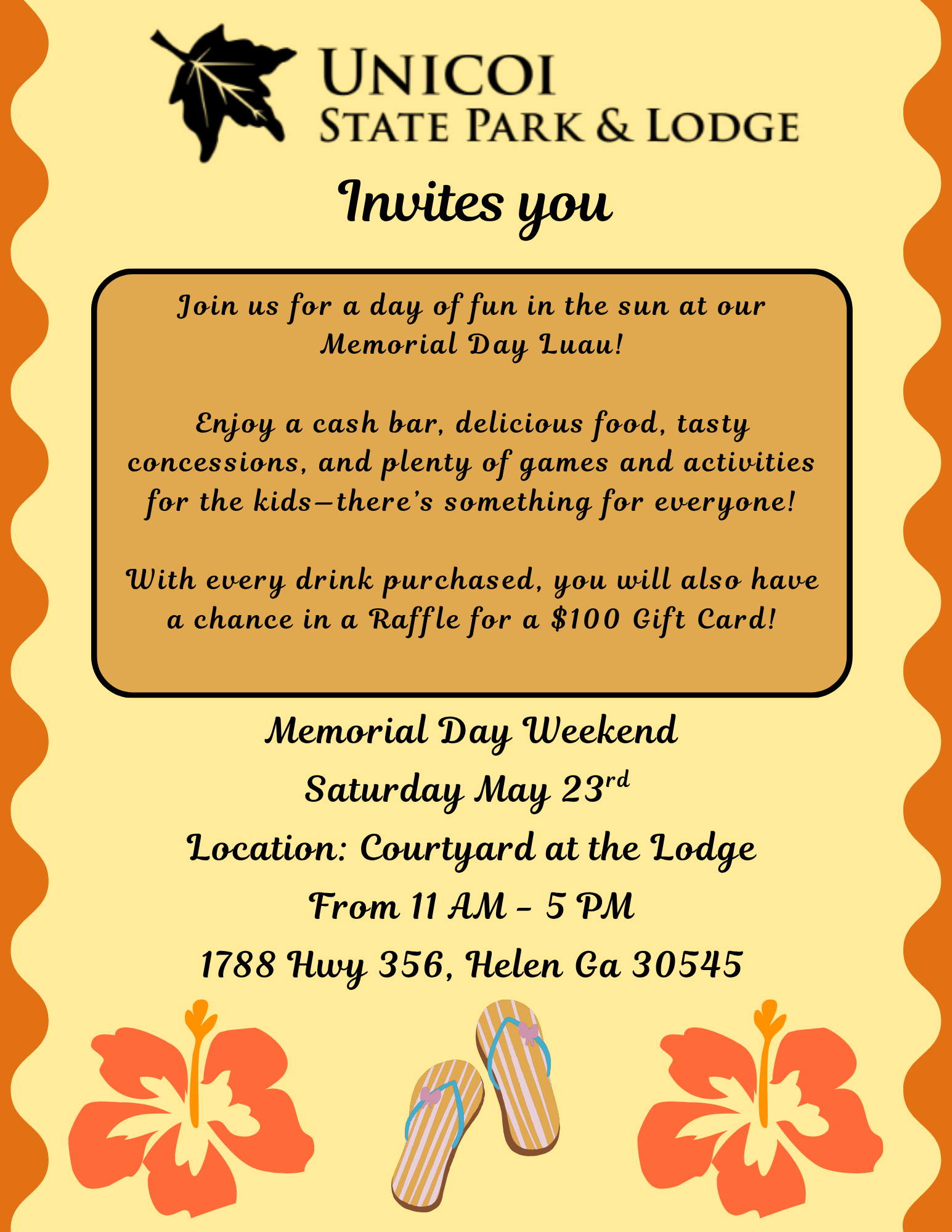 Join us for a day of fun in the sun at our Memorial Day Weekend Luau on Saturday, May 23, 2026 from 11am – 5pm in the Lodge Courtyard. Enjoy a cash bar, delicious food, tasty concessions, and plenty of games and activities for the kids – there’s something for everyone!