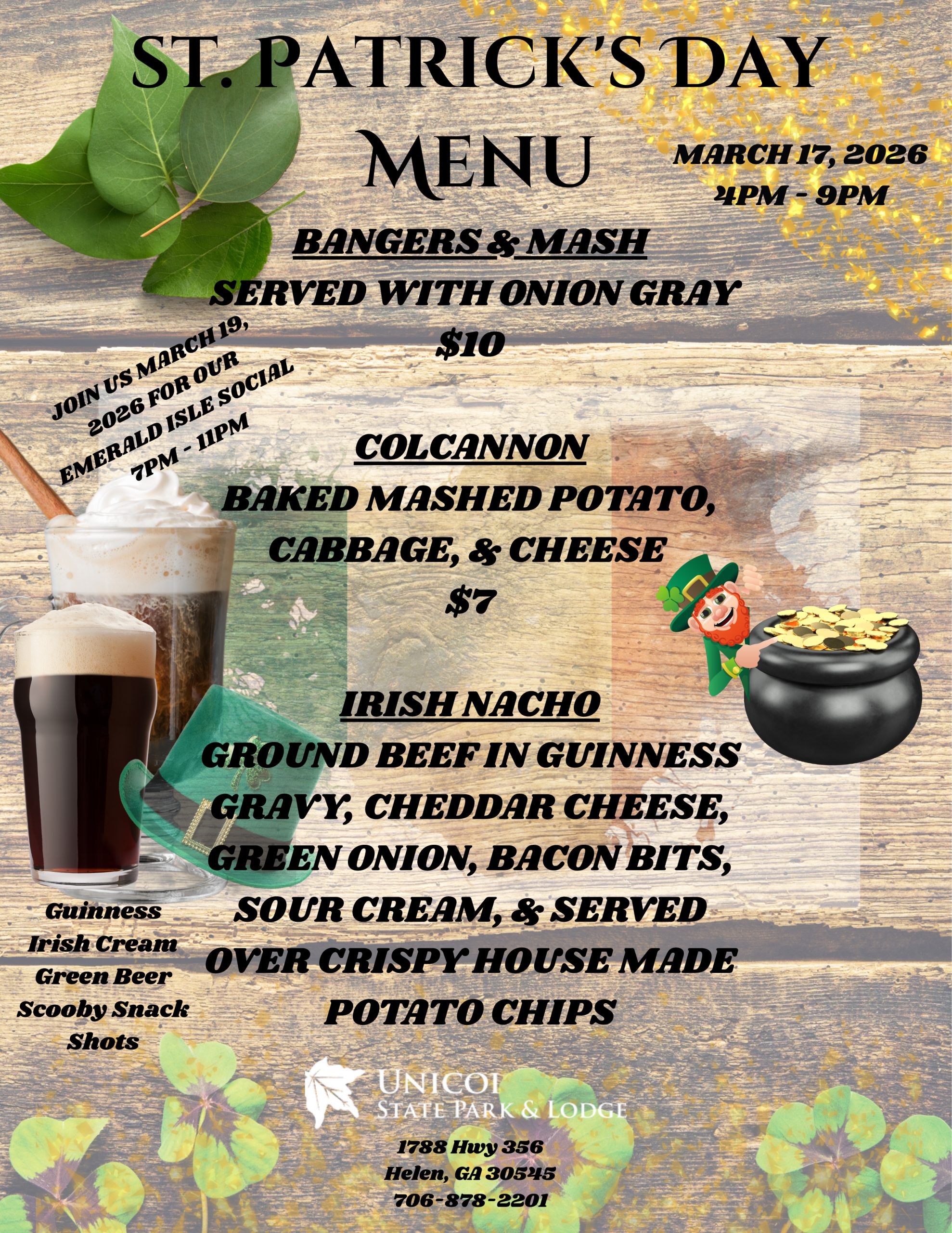 Join us in the Smith Creek Tavern on Tuesday, March 17, 2026 from 5pm – 9pm for a very special St. Patrick’s Day Menu. Enjoy our Irish-inspired dishes such as Bangers & Mash, Colcannon and Irish Nachos.