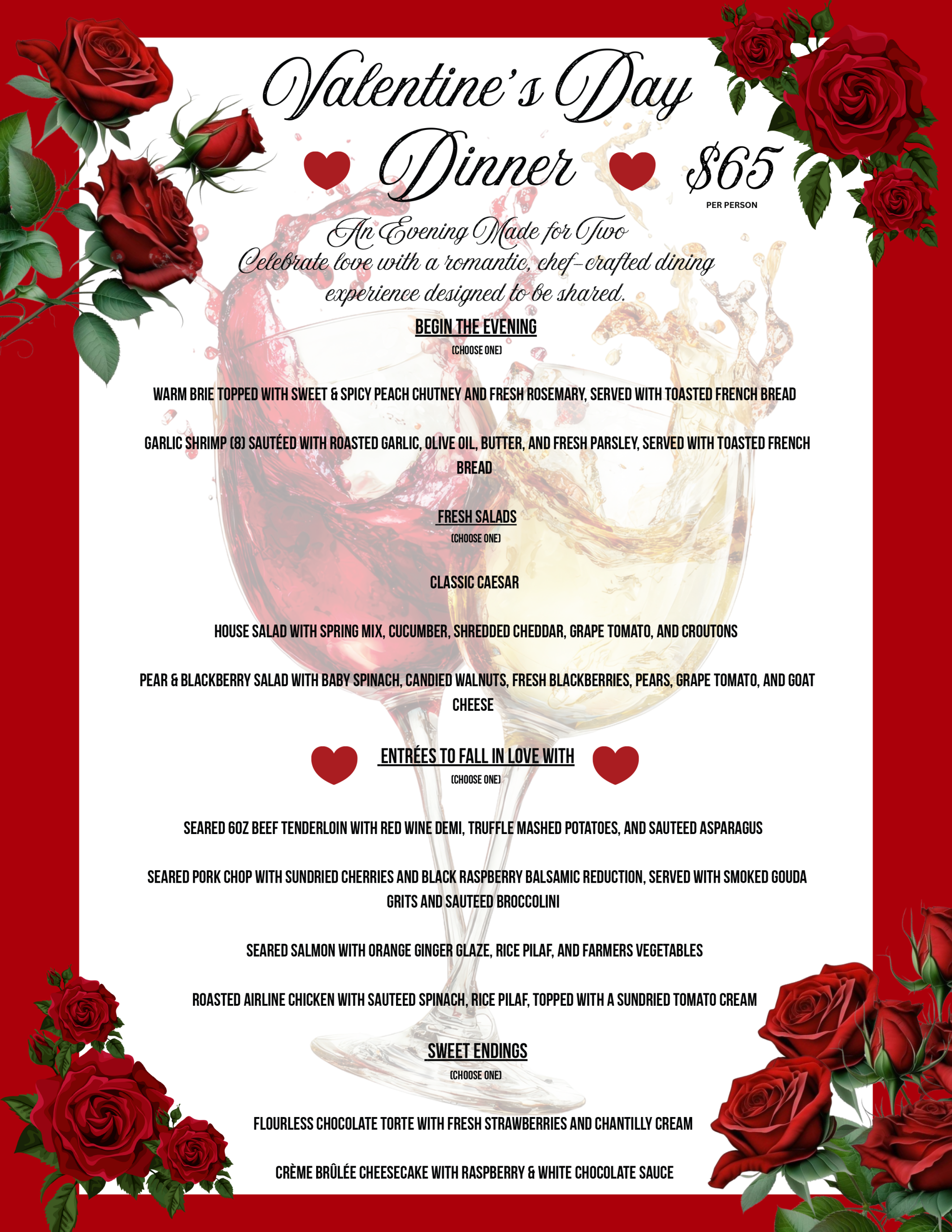 Join us in the restaurant on the 3rd floor of Unicoi Lodge Saturday, February 14, 2026 from 4pm – 8pm for a very special, chef-crafted Valentine’s Day Dinner for two. This 4-Course menu is designed to be shared. Only $65 per person. Reservations are strongly recommended.