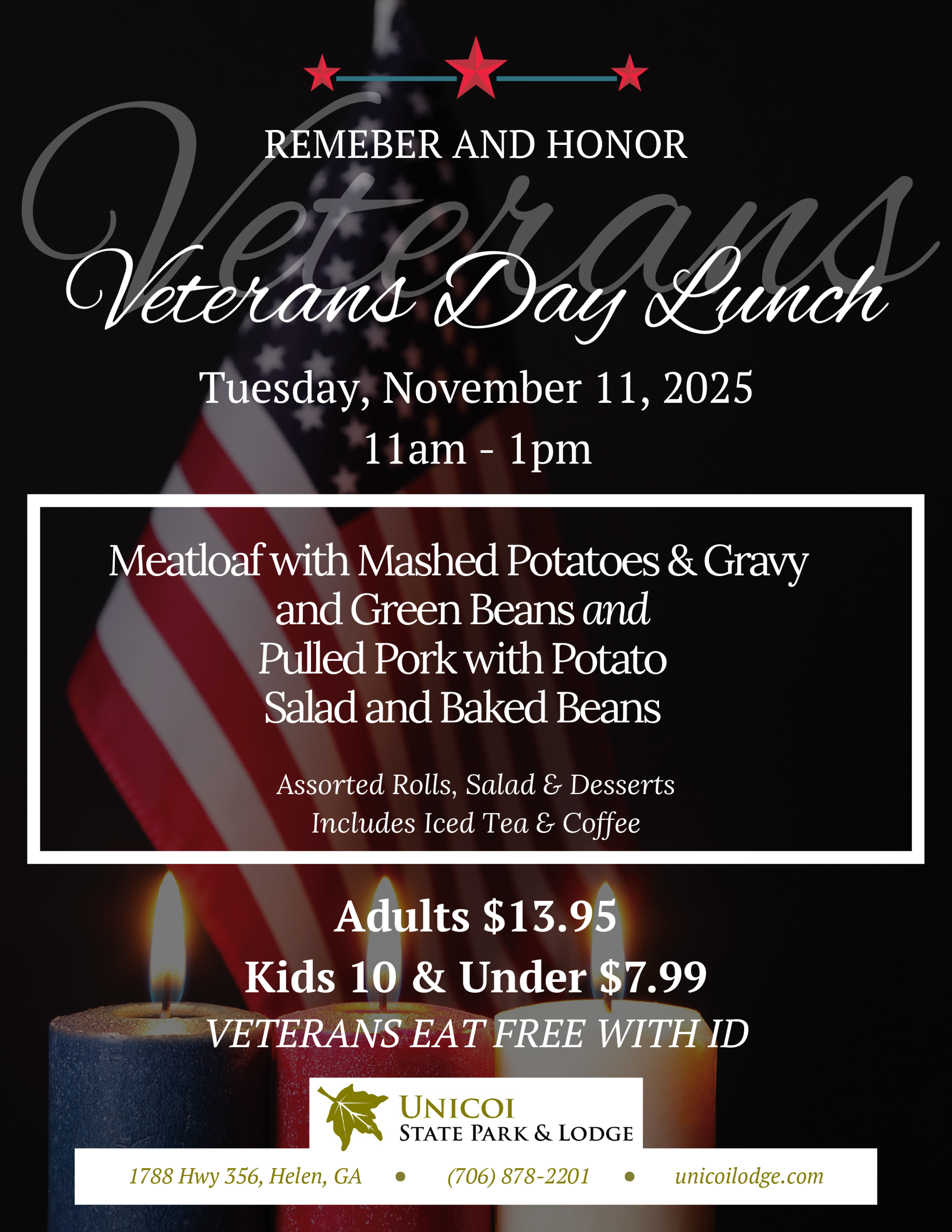 Join us in Unicoi Restaurant on Tuesday, November 11, 2025 for Veterans Day Lunch from 11am – 1pm. View our menu below. Veterans eat free with valid ID. Adults are $13.95 and Kids 10 and under are $7.99.